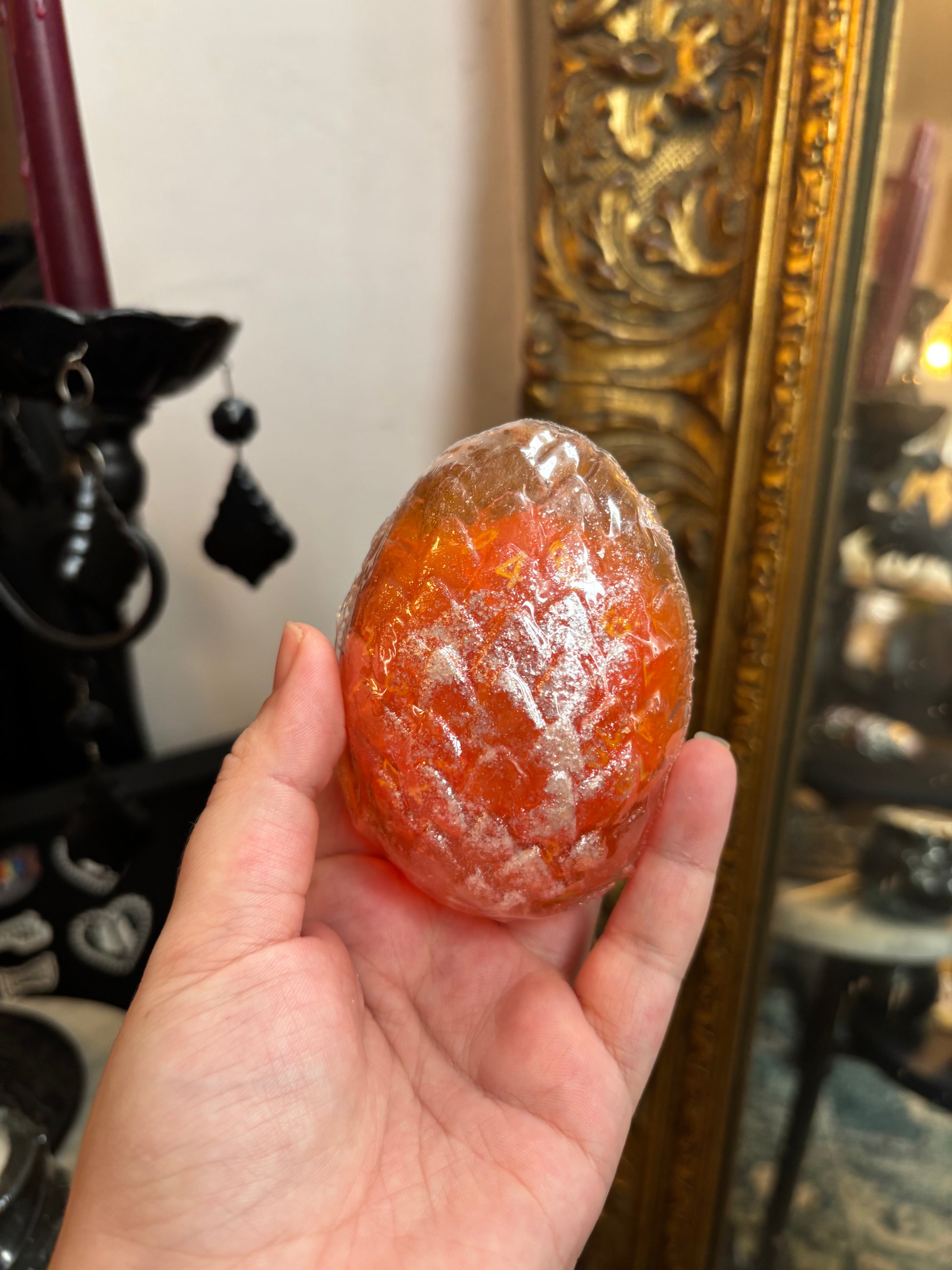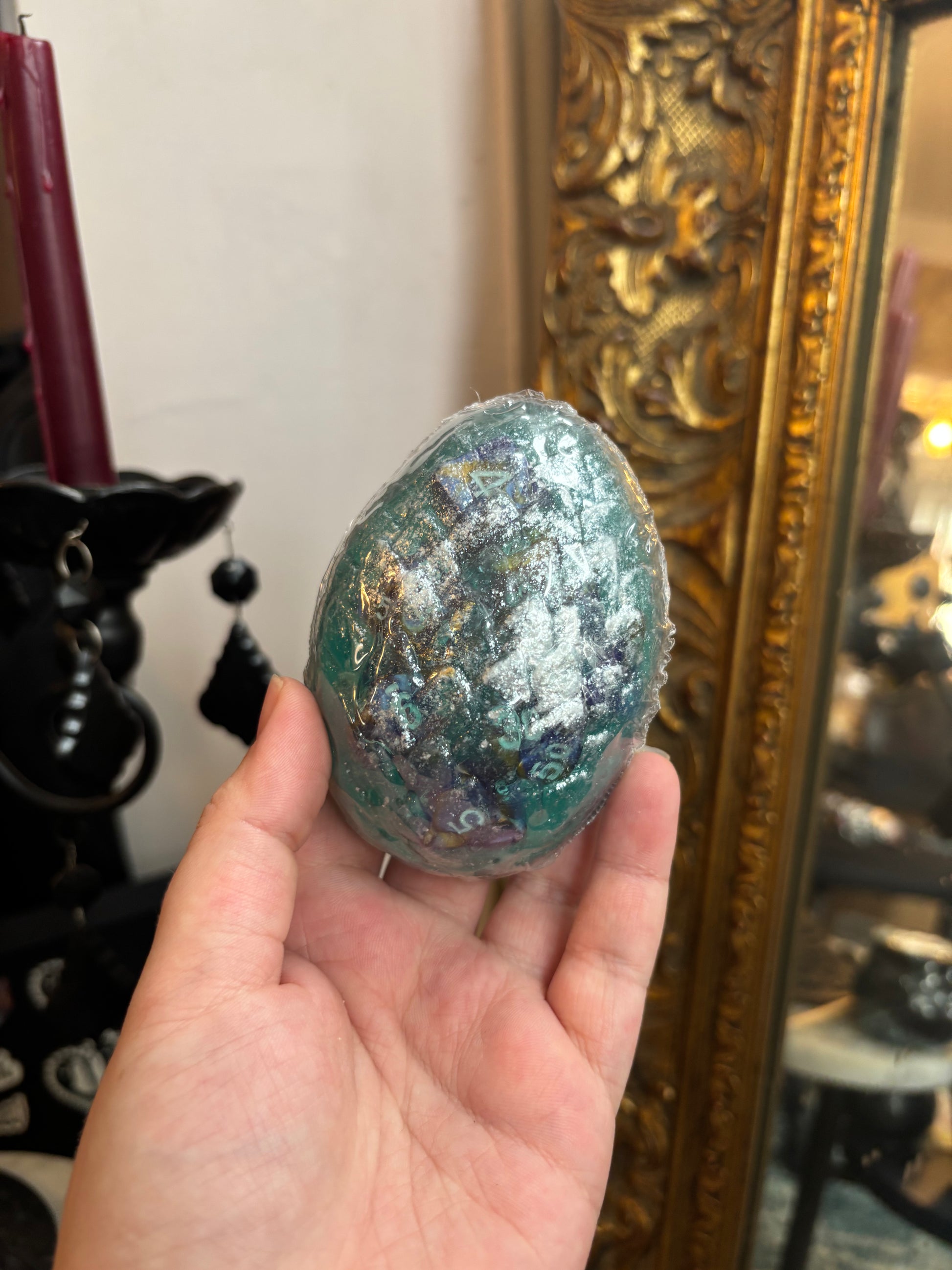 This dragon egg soap from artisanal bath co. is not as it seems! There is a surprise of many d20 dice in each half egg soap! Choose your color and adventure!