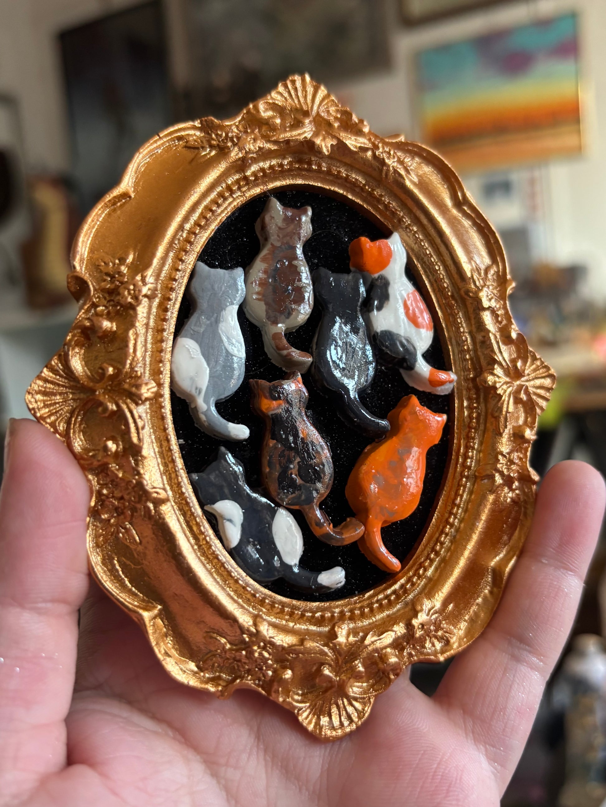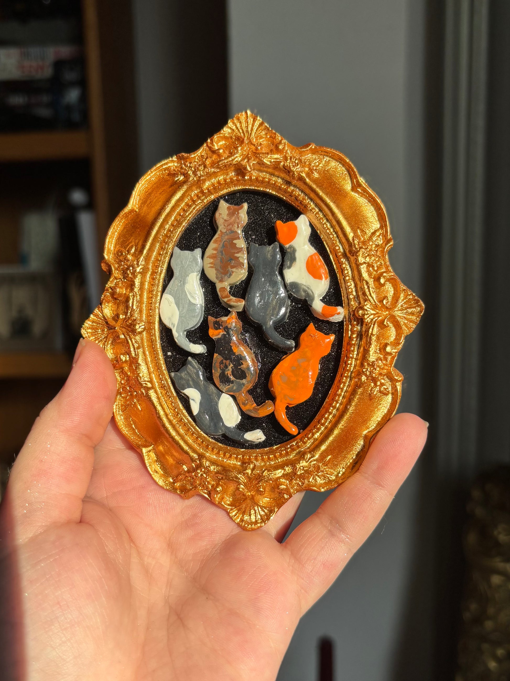 A clay cat portrait in a gold vintage frame, perfect for any cat loving person in your life! Whether you have 1, 2, or 7 little guys, you are guaranteed to love this representation of the wonderful breeds of kitty cats the world has to offer! Want to customize your breeds? Leave me a note of which cats you’d like to see in your portrait! Custom cat portraits have an extra processing time of 1-2 weeks! Thank you!